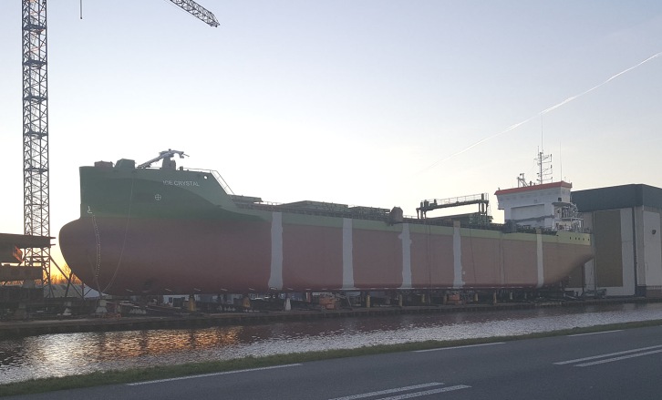 Launching of NB. 446 in Westerbroek on Saturday the 20TH of January at 11.00 hrs. 12 January 2017 On Saturday the 20th of January, 11.00 hrs, our Nb. 446 will be launched in Westerbroek. Nb. 446, named as ‘Ice Crystal’ is the second ship in a series of two from a new design that was developed for Erik Thun AB from Lidkoping, Sweden. Both vessels planned to replace the ‘Snowstar’ and ‘Icestar’, ships that were built by our yard approximately 20 years ago for the same owner. Nb. 446 is lengthened by 15.6 mtr. in comparison to her sistership Nb. 445 ‘Snow Crystal’, which was recently delivered as well. Nb. 445 and Nb. 446 are mini bulkers with iceclass 1A and 2 cargo holds. Their design is dedicated to some specific trades in the Baltic region. The breadth of the ships is limited to 13.35mtr, to be able to fit into the locks of the Trollhattan Canal, which off course will only be applicable for the shorter built. The ships are characterized by their extremely high deadweight of 5680 / 6550 tons. The propulsion installation consists of a 1950 kW Wartsila main engine running on MDO fuel, and driving a nozzled CP propeller. The accommodation will be suited for a crew of 8 persons. Further data Nb. 445 / Nb. 446 Loa 89.00 / 100.60 mtr B 13.35 mtr T 7.23 / 6.91 mtr DWT 5680 / 6550 tons Hold volume 207.000 / 264.000 cft