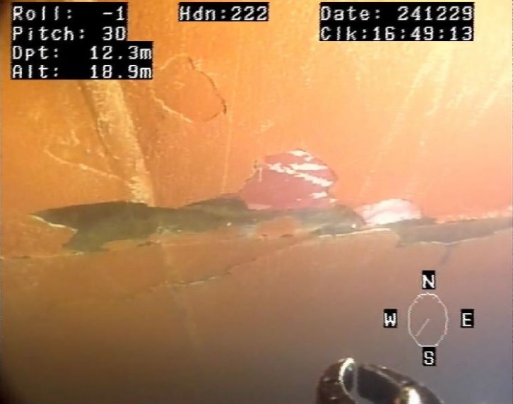 The underwater portion of the hull of the tanker Eagle has been depicted in the subsea investigation. On the left side of the vessel, near the bow, there are several fresh paint scrapes and impact marks made by the anchor chain. Photo: Border Guard
