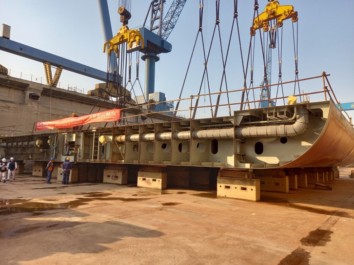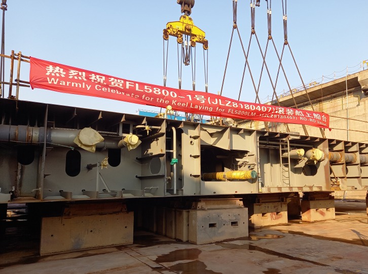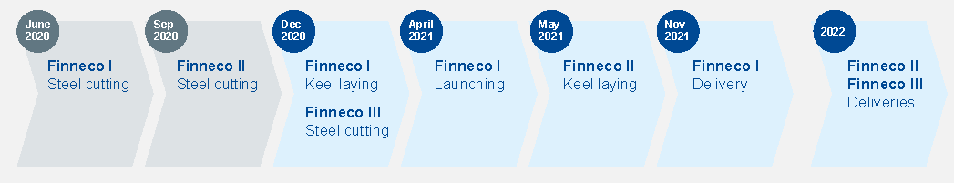 are now in construction Helsinki - 16 December 2020 Finnlines newbuilding programme has progressed as planned and now the last of the three new ultra-green ro-ro vessels ordered is in the production phase. The steel plates of the third new hybrid ro-ro were cut in a traditional steel cutting ceremony at the Nanjing Jinling shipyard in China on 16 December 2020. Furthermore, the keel laying of the first hybrid ro-ro took place on the same day. The new ro-ro vessels are part of Finnlines’ ongoing EUR 500-million newbuilding programme, which includes two eco-efficient ro-pax vessels in addition to the three hybrid ro-ro vessels. The newbuildings will improve the energy efficiency of the Company’s fleet, as well as reduce emissions, as they will be built with the latest environmentally efficient solutions and technologies. Lithium-ion battery systems will allow zero-emission port visits as well as modern two-stroke engines, emission abatement systems, solar panels and an innovative air lubrication system will cut emissions further. These new hybrid ro-ro vessels, Finneco I, Finneco II and Finneco III are expected to be delivered during 2021–2022. “In the past years, we have steered investments to sustainable development. We have invested in energy efficiency and green technologies and our newbuilding programme focuses on many energy-saving features. These world’s most environmentally friendly ro-ro vessels, and our entire newbuilding programme will continue to implement our sustainable strategy. In the future, we are able to meet the needs of our customers and society even better and continue to guarantee high-quality sea transport services,” says Emanuele Grimaldi, CEO of Finnlines. Hybrid ro-ro vessel, work in progress: