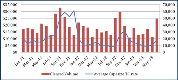 Average Capesize TC Rate v Cleared Volume. Source: Clearing Houses and Baltic Exchange The strong rebound of interest in Capesize trading can be explained by the high levels of volatility present in this sector. So far in 2013, the Capesize market has shown volatility of 78%, compared to iron ore at around 30% and fuel oil around 20%. The upturn in the Capesize spot market has been helped by a rebound in iron ore prices and an increase in chartering activity as Chinese buyers restock following a prolonged period of running down backlog levels. In addition, there appears to be greater confidence in steel market prospects for the months to come, while deliveries of new vessels have slowed. About FIS FIS is a leading provider of impartial and accurate risk management advice to customers in freight, steel, iron ore and fertilizer derivative markets and also provides physical commodity and shipbroking services. Founded in 2002, FIS has enjoyed sustained growth in each year of its operation and has expanded via its network of trading associates and branch offices to offer coverage in the United States, UK, Dubai, India South Korea, Singapore and Shanghai. The company is registered and regulated by the Financial Conduct Authority (FCA) in UK. Learn more about FIS at: www.freightinvestor.com FIS press release |