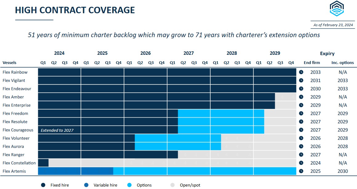 Hamilton, Bermuda - February 23, 2024 Flex LNG Ltd. ("Flex LNG" or "Company") (NYSE/OSE: FLNG) has received notice that the charterer of Flex Courageous, a super major, has exercised its first extension option. Flex Courageous was fixed on a three-year Time Charter on November 1, 2021, together with Flex Resolute which was also recently extended by two years until 2027. The commencement of the Time Charter for Flex Courageous was February 2022. Under the Time Charter, the charterer has the option to extend the period by two consecutive two year periods. Following this first option declaration, Flex Courageous will be firm until first quarter of 2027. The charterer will then have a final option to extend the Time Charter by another two years until 2029. Please find the updated contract overview attached: