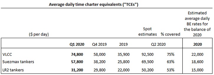The estimated average daily cash breakeven rates are the daily TCE rates the vessels must earn in order to cover operating expenses including dry docks, repayments of loans, interest on loans, bareboat hire, time charter hire and net general and administrative expenses. Spot estimates are provided on a load-to-discharge basis. The rates quoted are for days currently contracted. The actual rates to be earned in the second quarter of 2020 will therefore depend on the number of additional days we contract, and more importantly the number of additional days that each vessel is laden. Therefore, a high number of ballast days at the end of the quarter will limit the amount of additional revenues booked on a load to discharge basis. Furthermore, when a vessel remains uncontracted at the end of the quarter, the Company will recognize certain costs during the uncontracted days up until the period end, whereas if a vessel is contracted, then certain costs can be deferred and recognized over the load-to-discharge period. The reporting of revenues on a load-to-discharge basis results in revenues being recognized over fewer days, but at a higher rate for those days. Over the life of a voyage there is no difference in the total revenues and costs to be recognized. When expressing TCE per day for the first quarter of 2020, the Company uses the total available days for the quarter and not just the number of days the vessel is laden. Frontline Ltd. press release