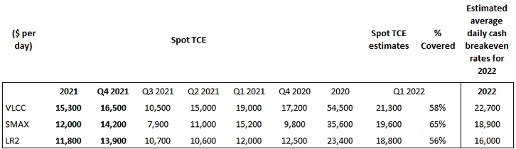 The estimated average daily cash breakeven rates are the daily TCE rates our vessels must earn to cover operating expenses including dry docks, repayments of loans, interest on loans, bareboat hire, time charter hire and net general and administrative expenses for the remainder of the year. Spot estimates are provided on a load-to-discharge basis, whereby the Company recognizes revenues over time ratably from commencement of cargo loading until completion of discharge of cargo. The rates reported are for all contracted days up until the last contracted discharge of cargo for each vessel in the quarter. The actual rates to be earned in the first quarter of 2022 will depend on the number of additional days that we can contract, and more importantly the number of additional days that each vessel is laden. Therefore, a high number of ballast days at the end of the quarter will limit the amount of additional revenues to be booked on a load-to-discharge basis. Ballast days are days when a vessel is sailing without cargo and therefore, we are unable to recognize revenues. Furthermore, when a vessel remains uncontracted at the end of the quarter, the Company will recognize certain costs during the uncontracted days up until the end of the period, whereas if a vessel is contracted, then certain costs can be deferred and recognized over the load-to-discharge period. The recognition of revenues on a load-to-discharge basis results in revenues being recognized over fewer days, but at a higher rate for those days. Over the life of a voyage there is no difference in the total revenues and costs to be recognized as compared to a discharge-to-discharge basis. When expressing TCE per day the Company uses the total available days, net of off hire days and not just the number of days the vessel is laden. Full report Frontline Ltd. press release