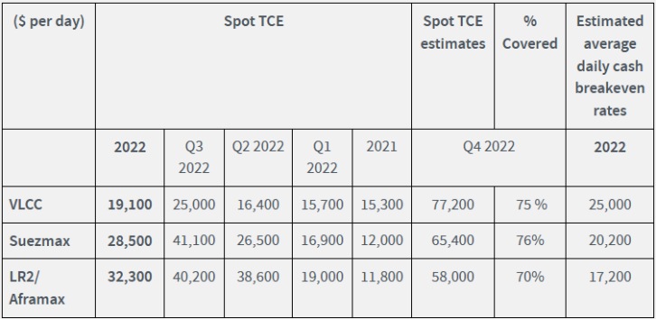 The estimated average daily cash breakeven rates are the daily TCE rates our vessels must earn to cover operating expenses including dry docks, repayments of loans, interest on loans, bareboat hire, time charter hire and net general and administrative expenses for the remainder of the year. Spot estimates are provided on a load-to-discharge basis, whereby the Company recognizes revenues over time ratably from commencement of cargo loading until completion of discharge of cargo. The rates reported are for all contracted days up until the last contracted discharge of cargo for each vessel in the quarter. The actual rates to be earned in the fourth quarter of 2022 will depend on the number of additional days that we can contract, and more importantly the number of additional days that each vessel is laden. Therefore, a high number of ballast days at the end of the quarter will limit the amount of additional revenues to be booked on a load-to-discharge basis. Ballast days are days when a vessel is sailing without cargo and therefore, we are unable to recognize revenues on such days. Furthermore, when a vessel remains uncontracted at the end of the quarter, the Company will recognize certain costs during the uncontracted days up until the end of the period, whereas if a vessel is contracted, then certain costs can be deferred and recognized over the load-to-discharge period. The number of ballast days at the end of the third quarter were 332 for VLCCs, 367 for Suezmax tankers and 269 for LR2/Aframax tankers. The recognition of revenues on a load-to-discharge basis results in revenues being recognized over fewer days, but at a higher rate for those days. Over the life of a voyage there is no difference in the total revenues and costs to be recognized as compared to a discharge-to-discharge basis. When expressing TCE per day the Company uses the total available days, net of off hire days and not just the number of days the vessel is laden. Frontline Ltd. press release