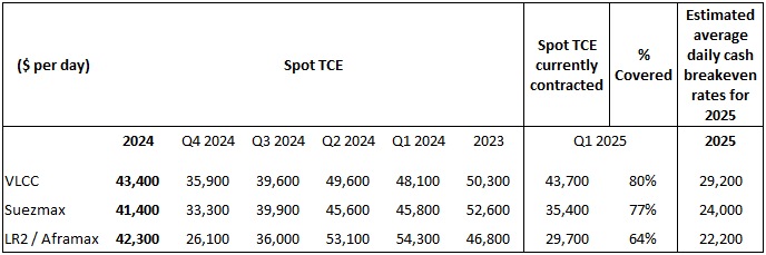 • Fully drew down a sale-and-leaseback agreement in an amount of $512.1 million to refinance 10 Suezmax tankers, which generated net cash proceeds of $101.0 million in the fourth quarter of 2024. • Sold its oldest Suezmax tanker, built in 2010, for a net sales price of $48.5 million and delivered the vessel to its new owner in October 2024. The transaction generated net cash proceeds of $36.5 million after repayment of existing debt and a gain of $17.9 million in the fourth quarter of 2024. • Repaid the remaining $75.0 million outstanding under the $275.0 million senior unsecured revolving credit facility with an affiliate of Hemen Holding Limited, the Company's largest shareholder ("Hemen") in the fourth quarter of 2024. Entered into three senior secured credit facilities for a total amount of up to $239.0 million to refinance outstanding debt on three VLCCs and one Suezmax tanker and, in addition, to provide revolving credit capacity in a total amount of up to $91.9 million. Lars H. Barstad, Chief Executive Officer of Frontline Management AS, commented: "The fourth quarter of 2024 came in unusually soft compared to previous years. Global oil demand was up marginally as the year came to an end, but global seaborne exports slowed in the fourth quarter. During the quarter we saw positive developments in the enforcement of sanctions against Iran and Russia in particular, but we could not escape the fact that these two countries represent a material part of the supply to Asia, at cost to demand for the vessels Frontline operates. For 2025 we have already seen broader sanctions with a wider scope, at the same time as key importers of exposed crude are diversifying away from the mentioned suppliers. Compliant fleet growth for the asset classes we deploy peaked a few years back, making the outlook very constructive as Frontline sail into the new year with our cost-efficient operations and modern fleet." Inger M. Klemp, Chief Financial Officer of Frontline Management AS, added: "In February 2025 we entered into three senior secured credit facilities for a total amount of up to $239.0 million to refinance three existing term loan facilities, with total balloon payments of $142.0 million maturing during 2025, leaving the Company with no debt maturities until the end of 2026 and, in addition, to provide revolving credit capacity in a total amount of up to $91.9 million. Through these new financings we further strengthen our strong liquidity and reduce our borrowing costs and cash break even rates. We continue to focus on maintaining our competitive cost structure, breakeven levels and solid balance sheet to ensure that we are well positioned to generate significant cash flow and create value for our shareholders." Average daily TCEs and estimated cash breakeven rates