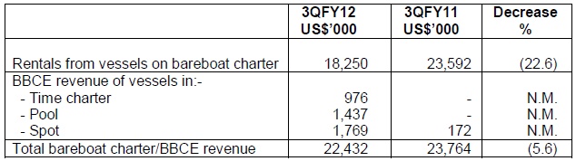 ii) Time Charter From 16 May 2012, FSL Singapore entered the time charter with Petrobras and hence she enjoyed the full three months of time charter income. FSL Hamburg, however, entered a similar time charter with Petrobras on 23 August 2012. The gross daily time charter rate for each vessel is US$14,000. On a combined basis, these two vessels contributed BBCE revenue of US$1.0 million from their time charter employment during the quarter. iii) Pool The ‘Nordic Siva’ pool commenced deployment of the Trust’s chemical tankers, FSL New York and FSL Tokyo in July 2012 and the third chemical tanker, FSL London in August 2012. Collectively, these vessels generated net pool revenue of US$2.9 million. After deducting vessel operating expenses, these vessels earned BBCE revenue of US$1.4 million in 3QFY12. iv) Spot Total freight income of US$3.8 million was derived from the three chemical tankers before they entered the ‘Nordic Siva’ pool and from FSL Hamburg before she started her time charter with Petrobras. After deducting voyage and vessel operating expenses, these vessels generated BBCE revenue of US$1.8 million in 3QFY12. For the same period last year, only FSL Hamburg and FSL Singapore traded in the spot market and these vessels contributed BBCE revenue of US$172,000. Other operating expenses declined 8.0% year-on-year to US$16.0 million. The lower expenditure was due mainly to lower depreciation from the three chemical tankers (-US$1.0 million) and from the two vessels leased to TORM (-US$0.3 million), arising from the changes in the expected useful life and residual value of the vessels. Consequently, FSL Trust achieved a marginal improvement of 1.0% in net operating income to US$6.5 million. After accounting for finance expenses and other non-operating items, the Trust reported a small loss of US$186,000 compared to a small profit of US$152,000 in the same quarter last year. Net cash generated from operations declined 11.0% year-on-year to US$13.9 million and the Trust continued to pay its regular loan amortisation of US$11.0 million during the quarter. In line with the temporary loan covenant relaxation obtained in June 2012, no distributions have been declared. Cash and cash equivalents rose to US$33.2 million as at 30 September 2012 (US$30.8 million as at 30 June 2012). VESSEL PORTFOLIO PROFILE 20 out of 25 vessels in the Trust’s portfolio remain employed on long-term bareboat charters whilst two vessels are employed on time charters. As at 30 September 2012, these 22 vessels have a dollar-weighted average remaining lease period of approximately five years1. Including the remaining three chemical tankers employed in the pool, the combined portfolio of 25 vessels has a dollar-weighted average age of approximately seven years. As an update to the Trust’s announcement relating to its TORM charters made on 3 October 20122, FSLTM would like to add that subject to technical completion of TORM’s restructuring agreement, FSL Trust will receive an equity stake amounting to approximately 2.5% in the enlarged share capital of TORM in return for permanently amending the terms on its two charter contracts. OUTLOOK Mr. Philip Clausius, Chief Executive Officer of FSLTM said: “With the successful redeployment of our two product tankers and three chemical tankers from spot market to time charter and pool employment, we can expect more stable earnings from our vessel portfolio. Together with the loan covenant relaxation previously obtained from our lenders, this improves our operational profile and should stand us in good stead to ride out the challenges ahead. However, some of our lessees continue to be under pressure and there is possibility of further downside risks. We will stay vigilant and continue to manage our vessel portfolio responsibly to secure a sustainable future for the Trust.” Conference Call for 3QFY12 Results FSLTM will host a conference call for all registered participants on Tuesday, 30 October 2012 at 10.00 am (Singapore time) to discuss the results. An audio recording of the conference call will be available on FSL Trust’s website at www.FSLTrust.com from 12.00pm (Singapore time) on Wednesday, 31 October 2012. 1 Excluding extension periods and early buy-out options. 2 Press release: “FSL Trust provides update on TORM charters”, dated 3 October 2012. First Ship Lease Trust press release |
