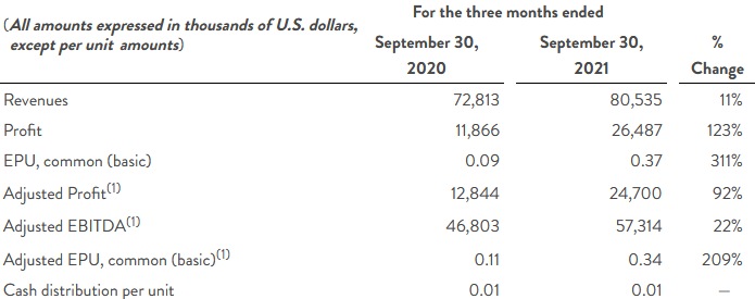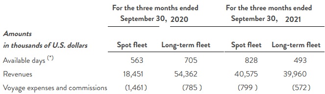 There were 1,321 available days for the three months ended September 30, 2021, as compared to 1,268 days for the three months ended September 30, 2020. The year-over-year increase in available days is mainly attributable to fewer off-hire days due to scheduled dry-dockings in the third quarter of 2021 (59 compared to 104 in the third quarter of 2020). Management classifies the Partnership’s vessels from a commercial point of view into two categories: (a) spot fleet and (b) long-term fleet. The spot fleet includes all vessels under charter party agreements with an initial duration of less than (or equal to) five years (excluding optional periods), while the long-term fleet comprises all vessels with charter party agreements of an initial duration of more than five years (excluding optional periods). For the three months ended September 30, 2020 and 2021, an analysis of available days, revenues and voyage expenses and commissions per category is presented below: