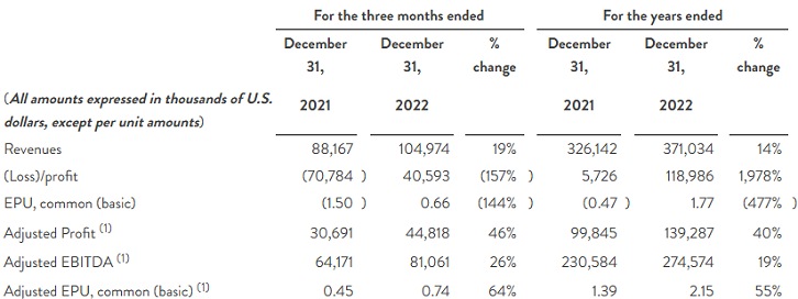 There were 1,288 available days (2) for the quarter ended December 31, 2022, as compared to 1,380 available days (2) for the quarter ended December 31, 2021. The quarter-over-quarter decrease is attributable to the sale of the Methane Shirley Elisabeth in the third quarter of 2022. Revenues were $105.0 million for the quarter ended December 31, 2022, compared to $88.2 million for the same period in 2021. The increase of $16.8 million is mainly attributable to a net increase in revenues from our vessels operating in the spot and short-term markets in the fourth quarter of 2022, in line with the continued strength of the LNG shipping spot and short-term markets. This increase was partially offset by a decrease in revenues due to the sale of the Methane Shirley Elisabeth in the third quarter of 2022. Vessel operating costs were $18.0 million for the quarter ended December 31, 2022, compared to $18.9 million for the same period in 2021. The decrease of $0.9 million in vessel operating costs is mainly attributable to a more favorable EUR/USD exchange rate in the fourth quarter of 2022 compared to the same period in 2021, and the sale of the Methane Shirley Elisabeth in the third quarter of 2022, partially offset by the in-house management of the Solaris (after her redelivery into our managed fleet on April 6, 2022). As a result, daily operating costs per vessel decreased to $13,974 per day for the quarter ended December 31, 2022 from $14,695 per day for the quarter ended December 31, 2021. General and administrative expenses were $4.2 million for the quarter ended December 31, 2022, compared to $3.5 million for the same period in 2021. The increase of $0.7 million is mainly attributable to the increase in administrative services fees for our fleet, effective January 1, 2022, in connection with the increase in the annual fee per vessel payable to GasLog compared to prior year (approximately $0.3 million per vessel per year), which was partially offset by a decrease in administrative fees due to the sale of the Methane Shirley Elisabeth in the third quarter of 2022. Daily general and administrative expenses increased to $3,240 per vessel ownership day for the quarter ended December 31, 2022, from $2,543 per vessel ownership day for the quarter ended December 31, 2021. Adjusted EBITDA (1) was $81.1 million for the quarter ended December 31, 2022, compared to $64.2 million for the same period in 2021. The increase of $16.9 million is mainly attributable to the increase in revenues of $16.8 million described above. The Partnership recognized an aggregate non-cash impairment loss of $4.4 million with respect to two of its Steam vessels for the quarter ended December 31, 2022, in accordance with International Financial Reporting Standards ("IFRS"), as compared to an aggregate impairment loss of $104.0 million for the same period in 2021. The principal factors that led to the recognition of a non-cash impairment loss in the fourth quarter of 2022 included the continuous decline in the fair values of Steam vessels, driven by reduced market expectations of the long-term rates for these older technology vessels, combined with potential costs of compliance with environmental regulations applicable from 2023 onwards. Financial costs were $15.7 million for the quarter ended December 31, 2022, compared to $9.4 million for the same period in 2021. The increase of $6.3 million in financial costs is mainly attributable to the increase in interest expense on loans, mainly due to an increase in base interest rates (London Interbank Offered Rate, "LIBOR", and Secured Overnight Financing Rate, "SOFR") in the fourth quarter of 2022 as compared to the same period in 2021. During the quarter ended December 31, 2022, we had an average of $952.7 million of outstanding indebtedness with a weighted average interest rate of 5.9%, compared to an average of $1,137.7 million of outstanding indebtedness with a weighted average interest rate of 2.4% during the quarter ended December 31, 2021. Gain on derivatives was $0.4 million for the quarter ended December 31, 2022, compared to $1.8 million for the same period in 2021. The decrease of $1.4 million is attributable to a decrease in unrealized gain from the mark-to-market valuation of interest rate swaps, which were carried at fair value through profit or loss, mainly due to changes in the forward LIBOR curve, partially offset by a decrease in realized loss on interest rate swaps. Profit was $40.6 million for the quarter ended December 31, 2022, compared to a loss of $70.8 million for the same period in 2021. The increase in profit of $111.4 million is mainly attributable to a decrease in the non-cash impairment loss of $99.6 million and an increase in revenues of $16.8 million, partially offset by an increase in financial costs of $6.3 million, as described above. Adjusted Profit (1) was $44.8 million for the quarter ended December 31, 2022, compared to $30.7 million for the same period in 2021. The increase in Adjusted Profit of $14.1 million is mainly attributable to the increase in revenues discussed above. As of December 31, 2022, we had $198.1 million of cash and cash equivalents, of which $57.2 million was held in current accounts and $140.9 million was held in time deposits with an original duration of up to three months. An additional amount of $25.0 million of time deposits with an original duration of greater than three months was classified under short-term cash deposits. As of December 31, 2022, we had an aggregate of $921.9 million of bank borrowings outstanding under our credit facilities, of which $90.4 million was repayable within one year, and an aggregate of $62.6 million of lease liabilities mainly related to the sale and leaseback of the GasLog Shanghai and Methane Heather Sally, of which $17.4 million was payable within one year. As of December 31, 2022, our current assets totaled $243.0 million and current liabilities totaled $177.2 million, resulting in