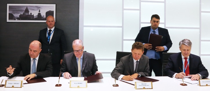 June 18, 2015 Alexey Miller, Chairman of the Gazprom Management Committee, Klaus Schaefer, Member of the Management Board of E.ON, Ben van Beurden, Chief Executive Officer of Royal Dutch Shell and Manfred Leitner, Member of the Executive Board of OMV signed Memorandums of Intent stipulating the cooperation among the said companies within the project for constructing the gas transmission infrastructure for direct supply of Russian gas to European consumers. The documents were inked today within the St. Petersburg International Economic Forum 2015. The Memorandum reflects the parties’ intent to implement a project for the construction of two gas pipeline strings from the Russian coast to the German coast via the Baltic Sea. The capacity of the new gas pipeline will reach 55 billion cubic meters a year. Considering the drop in domestic gas production in Europe as well as the global growth in gas demand, the parties pointed out the need to create new infrastructure to secure reliable supplies of the eco-friendly fuel to European consumers. In the near future the parties will launch the incorporation of a joint project company. They are planning to draw on the positive experience and best practices of Nord Stream AG obtained by the company since 2012, including the completed pre-investment study. “Upon commissioning of the Nord Stream gas pipeline, Gazprom has been looking into the possibility of boosting the capacity of this route. Today, jointly with our partners, we are starting this project. Extra gas transmission facilities along the shortest route connecting gas fields in Russia’s north to European markets will provide for higher security and reliability of supplies under new contracts,” stated Alexey Miller. “With this project we plan to continue and expand our successful partnership with Gazprom. The experience gained in Nord Stream has demonstrated that transportation of gas through the Baltic Sea is a reliable solution for the EU energy needs from the economic, technical and environmental points of view,” said Klaus Schaefer. “Natural gas will remain an integral part of the European energy mix, that’s why such new projects are important to satisfy the demand for energy carriers, especially with an account of the declining domestic gas production in Europe,” pointed out Ben van Beurden. “It is an important step towards higher security of gas supplies to Central Europe, and it will enhance the role of Baumgarten in Austria as a gas hub. Our almost 50-year cooperation with Gazprom should contribute to the success of this initiative that will provide for the further diversification of energy routes to Europe,” said Manfred Leitner.