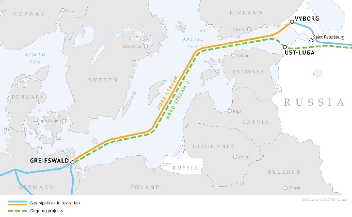 Nord Stream and Nord Stream 2 gas pipelines. Image by Gazprom.