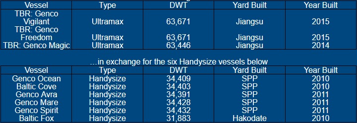 The transaction, which is part of Genco’s efforts to modernize its fleet and create a more focused asset base while reducing its carbon footprint, is structured as an asset swap without monetary consideration or additional capital required. The vessels are scheduled to deliver to both parties through the first quarter of 2021. Through the execution of this transaction, which is cash and asset value neutral, Genco will maintain its sizeable liquidity position and accomplish a number of other key objectives including the following: • Continue to build scale in the core Ultramax sector and complement our in-house commercial platform while divesting non-core assets; • Reduce the average age of Genco’s fleet by 0.3 years; • Avoid drydocking and ballast water treatment system costs in 2021 of approximately $3.6 million relating to three of the Handysize vessels included in the transaction; • Preserve exposure to the upside of the Capesize sector A breakdown of the vessels included in the deal is below: Genco is to acquire the following three Ultramax vessels