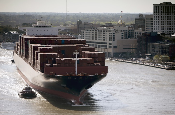 The ZIM Tianjin sails up river past Savannah's historic downtown on the way to the Georgia Ports Authority Port of Savannah on its maiden voyage, Thursday, March 18, 2015. The 10,000-TEU vessel is the largest container ship to call on the Port of Savannah. The ZIM Tianjin is 1,145 feet long by 150 feet wide, nearly as long as the Empire State Building is tall. (GPA Photo/Stephen Morton) Georgia’s deepwater ports and inland barge terminals support more than 352,000 jobs throughout the state annually and contribute $18.5 billion in income, $66.9 billion in revenue and $2.5 billion in state and local taxes to Georgia’s economy. The Port of Savannah handled 8 percent of the U.S. containerized cargo volume and 10.9 percent of all U.S. containerized exports in FY2013. Georgia Ports Authority - press release