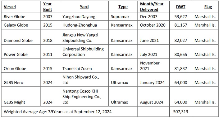 Glyfada, Greece - September 12, 2024 Globus Maritime Limited ("Globus", the "Company", "we", or "our") (NASDAQ: GLBS), a dry bulk shipping company, today reported its unaudited consolidated financial results for the second quarter and six-month period ended June 30, 2024. • Revenue - $9.5 million in Q2 2024 - $17.2 million in H1 2024 • Net income - $3.3 million net income in Q2 2024 - $3 million net income in H1 2024 • Adjusted EBITDA - $4 million in Q2 2024 - $6 million in H1 2024 • Time Charter Equivalent - $14,578 per day in Q2 2024 - $13,246 per day in H1 2024 Current Fleet Profile As of the date of this press release, Globus' subsidiaries own and operate seven dry bulk carriers, consisting of one Supramax, four Kamsarmax and two Ultramax.