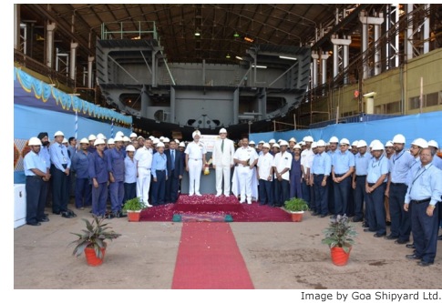Keel Laying ceremony of the Fourth of the New Class Offshore Patrol Vessels (OPVs) indigenously designed in–house and being built by Goa Shipyard Ltd (GSL) for the Indian Coast Guard was held at GSL on 9th Jan 2014.