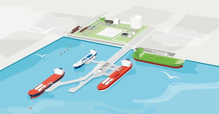 The plant's pipeline infrastructure can supply LNG for vessels at three berths. Fully expanded, the plant can also be supplied with LNG both from the sea side and the land side. Illustration: Swedegas.