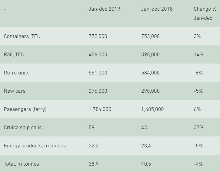 Much of the long-range export goods consists of basic industrial goods such as steel and forest products from all over Sweden. It is usually transported by rail to the port of Gothenburg for transport on container ships to export markets on the continent. Photo: Gothenburg Port Authority. Downturn and upturn in energy products As in the automotive segment, the energy segment during the first half of the year was unexceptional. Then came the upturn. Maintenance work at the refinery during the first half of the year and a fall in volume of 7 per cent were followed by a remarkable turnaround. During June-December 12.6 million tonnes of energy products were handled – the highest second-half figure in the company’s history. Best cruise year ever Gothenburg has never been as popular as a cruise destination than in 2019. More than 110,000 cruise passengers on 60 cruise ships visited Gothenburg – an all-time high. And there is every reason to be optimistic about the future. With 83 calls already scheduled for 2020, it is set to become yet another record-breaking year. Port of Gothenburg freight volumes 2019