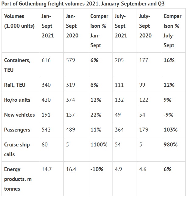 Image by Port of Gothenburg Handling of new vehicles at the port fell by 9 per cent during the third quarter – mainly due to the global shortage of semiconductors and components, which continues to blight the automotive industry. Nevertheless, volumes for the year through to September increased by 22 per cent. The backbone volumes from Volvo Cars topped with new import customers such as Tesla, Honda and Lynk & Co confirm that the Port of Gothenburg remains the largest vehicle port in Sweden. The Port’s intra-European ro-ro traffic – wheeled cargo to and from the United Kingdom, Denmark, Germany, and the central European hubs of Ghent and Zeebrugge in Belgium – rose by 9 per cent during the third quarter. All markets have reported positive growth. Passenger traffic is in a period of recovery. Passenger numbers for the third quarter doubled compared with last year. Cruise traffic has also recovered strongly with 60 calls between January and September compared with what was in effect a shutdown in 2020. After remaining low for the first half of the year, growth in demand for energy productscan be noted in the port’s handling figures. Volumes were up 6 per cent during the third quarter. Dry bulk, such as sand, gravel, and project cargo including for example prefabricated building sections and modules, pipes, and bridge elements, rose by 5 per cent during the year. The rise is linked in part to the fact that a large number of components used in the current infrastructure projects in Gothenburg arrive by sea.