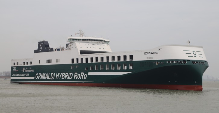 Naples - 12 March 2021 The Grimaldi fleet renewal and modernization program continues unabated. Today in Nanjing (China) the Neapolitan Group took delivery of the Eco Savona, the fourth of the twelve ultra-modern hybrid ro-ro units of the Grimaldi Green 5th Generation (GG5G) series ordered from the Jinling shipyard. The Eco Savona flies the Italian flag and, like her sister units, is a veritable green giant: the GG5G-class ships are in fact the largest ro-ro units in the world for short-sea shipping, as well as the most ecofriendly. The Eco Savona has a length of 238 meters, a beam of 34 meters, a gross tonnage of 67,311 tonnes and a service speed of 20.8 knots. If compared to the units of the previous series of ro-ro vessels deployed by the Grimaldi Group for short sea shipping, the new ship can accommodate double the load on her seven decks (two of which are hoistable): in fact, she can carry 7,800 linear meters of rolling freight, equivalent to around 500 trailers and 180 cars. Moreover, the quarter stern ramp allows the loading of freight units weighing up to 150 tons. However, the increase in capacity does not affect fuel consumption, thanks to the adoption of numerous highly innovative technological solutions that optimize the ship's fuel consumption and performance: in fact, at the same speed, the Eco Savona consumes the same amount of fuel compared to the previous generation ro-ro ships, and is therefore able to halve CO2 emissions per unit transported. Furthermore, during port stays, the Eco Savona is capable of cutting emissions to zero by using the electricity stored in mega lithium batteries with a total power of 5 MWh, which are recharged during navigation thanks to shaft generators and 350 m2 of solar panels. The vessel is also equipped with state-of-the-art, electronically controlled engines and with an exhaust gas cleaning system for the reduction of sulphur and particulate emissions. "It is a source of great pride for us to be able to put increasingly capacious, modern and environmentally friendly ships such as the Eco Savona at our customers' disposal," said Emanuele Grimaldi, Managing Director of the Neapolitan company. "The future of transport can only be based on eco-sustainability and efficiency, and also thanks to our Group's commitment this future is ever closer". Upon arrival in Italy from China next April, the Eco Savona will be deployed on the regular ro-ro service that connects Italy (Livorno and Savona) to Spain (Barcelona and Valencia), just like her sister vessels Eco Valencia, Eco Barcelona and Eco Livorno.