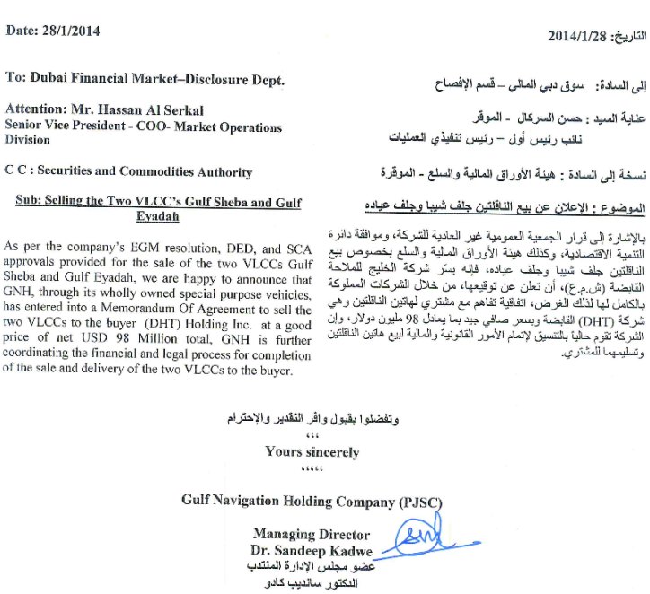 Selling the two VLCC's Gulf Sheba and Gulf Eyadah 29 January 2014 Gulf Navigation Holding PJSC press release