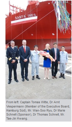 On Wednesday, 27 June 2012, Hamburg Süd celebrated the christening of its container ship “Santa Ines” at Daewoo Shipbuilding & Marine Engineering Co. Ltd. (DSME) in Geoje-City in Korea. Sponsor of the “Santa Ines” was Dr Marie Schnell, a daughter of Dr Arend Oetker.