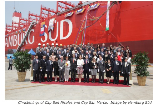 On Thursday, 23 May 2013, Hamburg Süd celebrated the double christening of its container ships “Cap San Nicolas” and “Cap San Marco” at the Hyundai Heavy Industries yard in Ulsan (South Korea). With a nominal slot capacity of 9,600 TEU, the two newbuildings are Hamburg Süd’s largest-ever vessels and, with 2,100 reefer plugs, the ships with the largest reefer capacity worldwide at present.