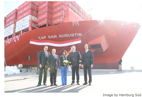The “Cap San Augustin” is the third container ship in a series of six newbuilds in the new “Cap San” class. After delivery from the Hyundai Heavy Industries shipyard in Ulsan (South Korea), the ship was introduced into the Group’s liner service between Asia and the South American East coast at the beginning of September 2013.