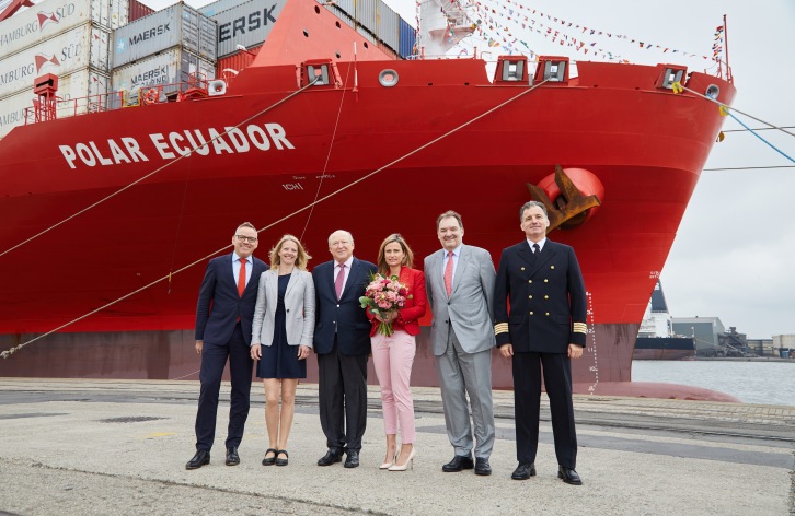 Naming ceremony held at Belgian New Fruit Wharf – Deployment in the EMCS service 20 March 2019 Hamburg/Antwerp, May 20, 2019. Hamburg Süd christened the “Polar Ecuador” container ship today in Antwerp. The sponsor of the “Polar Ecuador” is Sonia Van de Vyvere, wife of Philippe Van de Vyvere, owner and CEO of SEA-invest, one of the world’s largest terminal operators for dry bulk, liquid bulk and reefer cargo, including Belgian New Fruit Wharf. “Antwerp is a highly important port for Hamburg Süd, and the Belgian New Fruit Wharf is a very suitable place for the christening of a ‘Polar’-class vessel,” says Frank Smet, Chief Commercial Officer (CCO) of Hamburg Süd. “After all, with more than 1,000 reefer plugs, the ‘Polar Ecuador’ transports a disproportionately large volume of refrigerated cargo for a container vessel of this size from Mexico and the Caribbean to Antwerp. This includes, for example, bananas, pineapples and melons, which are handled particularly efficiently and professionally by the fruit and reefer specialists here." Hamburg Süd has had its own office in Antwerp since 1996, where some 50 employees now work. The “Polar Ecuador” is deployed in Hamburg Süd’s North Europe – Mexico/Caribbean service (EMCS), which connects Antwerp and other European ports in Ireland, Great Britain and Germany with important Mexican and Caribbean ports. Antwerp is one of the most important destinations in this region for onward distribution to other European markets, especially for bananas. The “Polar Ecuador” belongs to a group of four structurally identical vessels in the “Polar” class that have been built for Hamburg Süd by the Chinese shipyard Jiangsu New Yangzi Shipbuilding. With a total length of 230 meters and a width of 37.30 meters, the ship offers a container storage capacity of 3,800 TEU and is equipped with 1,000 reefer plugs.