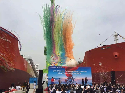 6 June 2016 On June, 6th, 2016, we held a grand ceremony for the first manufactured 38k DWT chemical stainless steel tanker (No. HT-CT38-001 ) at HT’s docks. This is a significant milestone for HT. The tanker is named as “SC AQUARIUS ” and is made for Gold Win, which is located in Hongkong. The company leaders, shipowner, Classification representatives all took part in the ceremony. After the ceremony, representatives of shipowner and Classification looked around the tanker and spoke highly of it. Hantong Ship Heavy Industry Co. Ltd. press release |