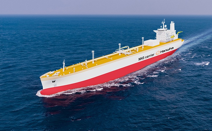A rendering from Hanwha Ocean shows one of the company's 93,000 cubic meter very large ammonia carriers (VLAC) ordered by Naftomar. Image by Hanwha. Ammonia is considered an environmentally friendly fuel that does not emit any carbon dioxide during combustion, making it a promising candidate for decarbonizing the maritime shipping industry. Last year, Hanwha Ocean received approvals in principle (AiPs) for an 86,000-cbm ammonia carrier from France's Bureau Veritas (BV) in September and the U.K.'s Lloyd's Register (LR) in October, two recognized global classification societies in the maritime sector. Hanwha Ocean is focusing on developing eco-friendly technologies to lead the era of carbon-free ships. Its strategy is rooted in gradually reducing greenhouse gas emissions and ultimately commercializing carbon-free ships that utilize alternative fuel technologies such as ammonia propulsion, hydrogen direct propulsion, and hydrogen fuel cell propulsion. (1) shaft generator motor system (SGM): A power generating system that uses the rotational force of the vessel's propulsion engine shaft to generate clean electricity. (2) Hanwha SmartShip Solution & Service (HS4): A smart ship solution developed by Hanwha Ocean that collects and analyzes data generated from ships in operation on land and provides ship owners with information that can improve operational efficiency and safety. The security and reliability of the provided data has been improved by utilizing a cloud-based land data platform. (3) ammonia dual-fuel engine: An engine used in vessels that can simultaneously burn ammonia with other fuel sources, including diesel and natural gas. Hanwha Ocean Hanwha Ocean is a leading global company with extensive expertise and experience in the shipbuilding and offshore industry. Boasting the world's most competitive LNG carriers built with eco-friendly and highly efficient technology, the company has continuously pioneered new businesses since 1973, producing a vast range of vessels, including commercial ships, drillships, and specialty ships. Hanwha Ocean will be at the forefront of pioneering advanced marine solutions for decarbonization and further expand Hanwha's green energy ecosystem to create positive, sustainable change throughout the world. For more information, visit: www.hanwhaocean.com Hanwha - press release