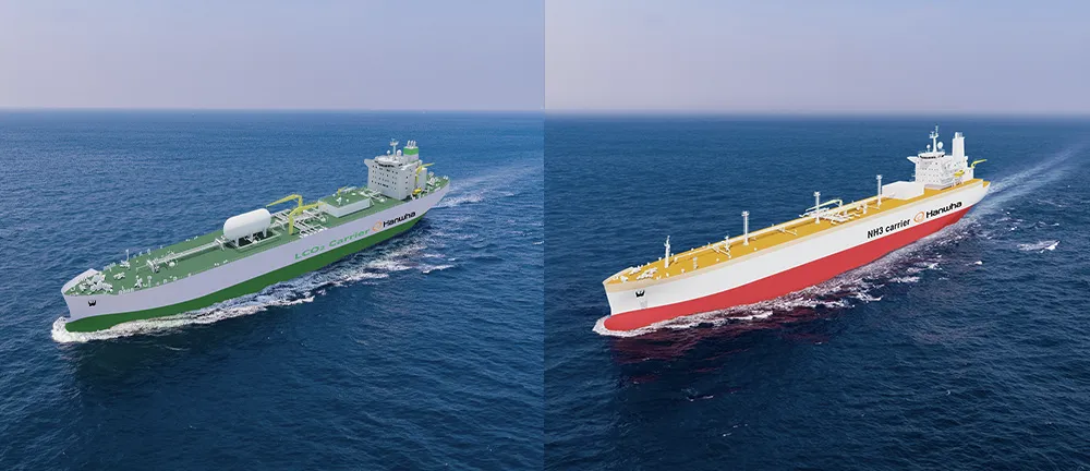 Hanwha Ocean's liquefied hydrogen carrier (left) and ammonia fueled ammonia carrier (right). Image by Hanwha. Key to realizing Hanwha Ocean's next-generation LNG carrier is Hanwha Power Systems' ammonia gas turbine technology. This carrier is designed to be completely carbon free by eliminating the need for pilot fuel, with the project expected to be completed by 2028. To advance this technology, Hanwha Power Systems signed a memorandum of understanding (MOU) with GasLog, a major European LNG carrier company, to explore converting LNG carrier propulsion systems into ammonia gas turbines and discuss demonstration measures for replacing the ships' fossil fuel engines with ecofriendly ammonia gas turbines. Expanding its portfolio of sustainable solutions, Hanwha Power Systems also showcased its ecofriendly ship retrofit business, enabling vessels currently running on fossil fuels to be converted to ammonia-powered systems. Meanwhile, Hanwha Engine, which joined Hanwha Group in March 2024, brings in-house expertise to rapidly develop and deploy ecofriendly engine solutions. The company presented its ecofriendly dual-fuel engine and equipment, which blends zero-carbon ammonia with existing fuels, significantly aiding carbon reduction. Hanwha Engine also offers long-term service agreements (LTSA) for life cycle care services and has introduced a green retrofit business for existing ships.