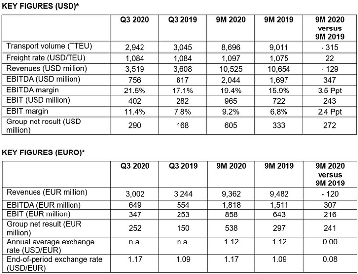 At around USD 10.5 billion (EUR 9.4 billion) after the first nine months of the year, revenues were about 1 percent below the prior-year figure. This can primarily be attributed to pandemic-related effects, including a double-digit drop in demand in the second quarter and an overall transport volume that was 3.5 percent lower than the prior-year figure, at 8,696 TTEU (9M 2019: 9,011 TTEU). The average freight rate was up 2 percent, to 1,097 USD/TEU (9M 2019: 1,075 USD/TEU), which had a positive impact on earnings. In addition, transport expenses decreased more than proportionately by 6 percent, due to a combination of lower transport volumes, a lower average bunker price of USD 402 per metric tonne (9M 2019: USD 425 per tonne), and rigorous cost management as part of the Performance Safeguarding Program (PSP). βIn this nine-month period, we have achieved a good result and strictly managed our costs while at the same time benefiting from improved market conditions in the third quarter. However, with its increasing number of cases worldwide, the COVID-19 pandemic continues to pose high risks to the logistics industry and the supply chains of our customers. We will stick to our present course, continue to implement our Strategy 2023, and keep a close eye on the well-being of our employees, the needs of our customers and our operating cost,β said Rolf Habben Jansen, CEO of Hapag-Lloyd. Based on the earnings forecast that was adjusted upwards in October, Hapag-Lloyd expects an EBITDA of EUR 2.4 to 2.6 billion and an EBIT of EUR 1.1 to 1.3 billion for the full financial year 2020. The financial report for the first nine months of 2020 is available online.