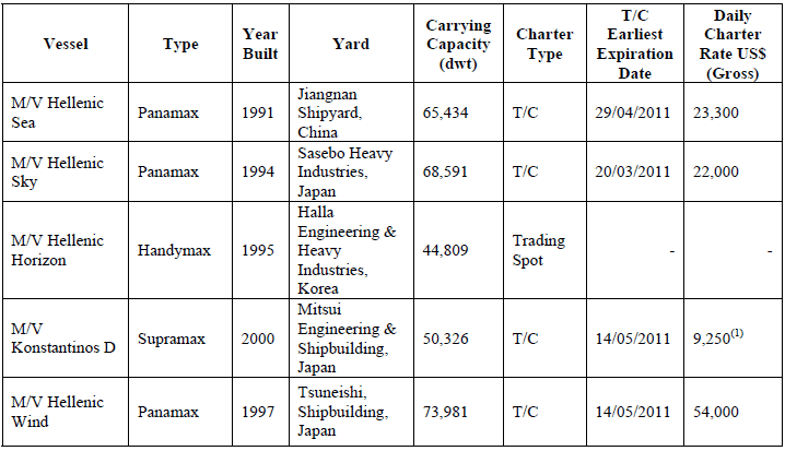 Following the delivery of the two Kamsarmax vessels, the Company will manage through Hellenic Shipmanagement Corp. a fleet of seven dry bulk carriers comprising two Kamsarmaxes, three Panamaxes, one Supramax and one Handymax with an aggregate carrying capacity of about 467,141 dwt and a weighted average age of 12.5 years (as of 31 March 2013).