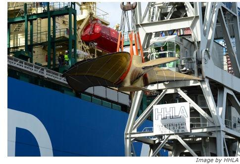 The world’s largest container ship propeller was loaded onto the "Hyundai Together" at the HHLA Container Terminal Altenwerder on Saturday about noon.