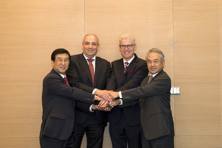 From left to right : Jae-hoon Bae (President and CEO of HMM), Rolf Habben Jansen (CEO of Hapag-Lloyd), Jeremy Nixon (CEO of Ocean Network Express), Bronson Hsieh (Chairman and CEO of Yang Ming). Image by HMM.