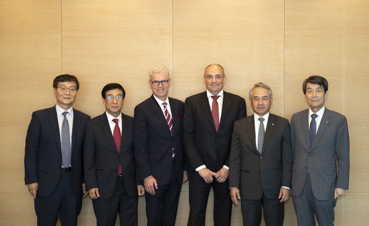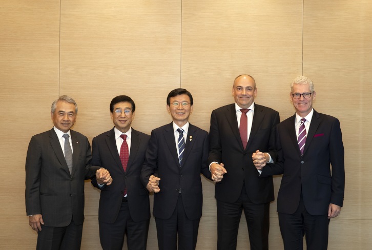 From left to right : Bronson Hsieh (Chairman and CEO of Yang Ming), Jae-hoon Bae (President and CEO of HMM), Seong-hyeok Moon (Minister of Oceans & Fisheries), Rolf Habben Jansen (CEO of Hapag-Lloyd), Jeremy Nixon (CEO of Ocean Network Express). Image by HMM.