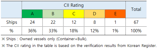 HMM reports 99% of its owned ships allowed to sail under CII rules 27 July 2023 HMM announced that 99% of its owned vessels are well-placed to keep their voyage under the CII (Carbon Intensity Indicator) regulation. This outcome resulted from the verification of "KR GEARs", a Greenhouse Gas(GHG) Emission Authentic Reporting system launched by the Korean Register(KR). CII (Carbon Intensity Indicator) The CII is a measure for a ship's energy efficiency implemented by the International Maritime Organization (IMO), targeting vessels above 5,000 gross tonnage. It is calculated as CO2 emitted per unit cargo volume(1ton) and nautical mile based on transportation records over the previous year and fuel consumption. CII is rated A, B, C, D, or E (where A is the best). The rating indicates a major superior, minor superior, moderate, minor inferior, or inferior performance level. A ship rated D for three consecutive years, or E, is required to submit a corrective action plan to show how the required index (C or above) would be achieved. The IMO plans to apply a CII rating from 2024 based on the performance of vessel operation in 2023. KR GEARs (GHG Emission Authentic Reporting system) KR GEARs features greenhouse gas online data management, including a real-time CII monitor, CII simulator, and ETS calculator. This platform enables the CII rating to be derived and managed in real time. Users also can automatically create their EU MRV Emission Report and IMO DCS Fuel Consumption Report. (Source : KR official website)