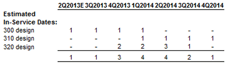 VT Halter Marine will construct eight vessels based on the Super 320 design that it developed for Hornbeck Offshore. These DP2 OSVs are designed to have 6,200 long tons of deadweight capacity, approximately 20,900 bbls of liquid mud carrying capability, 11,863 sq. ft. of deck area and a fire-fighting class notation. The Super 320 design is based on a larger version of the HOS Coral, an existing 290 class DP-2 OSV which the Company has successfully operated since her delivery in early 2009. The Super 320 design has been developed with particular attention to the most stringent regulations for environmental stewardship, including a double-hull that eliminates any fuel storage adjacent to the sideshell, and propulsion machinery that meets the requirements of EPA Tier 3 for stack emissions. The eight OSVs to be constructed by Eastern Shipbuilding Group will be DP-2 classed and consist of four vessels based on the STX Marine SV 300 design and four vessels based on the STX Marine SV 310 design. Features of the STX design include over 20,000 bbls of liquid mud carrying capacity and a fire-fighting class notation. In addition, the SV 300 design calls for 5,500 long tons of deadweight capacity and 10,976 sq. ft. of deck space, while the SV 310 design calls for 6,144 long tons of deadweight capacity and 11,536 sq. ft. of deck space. The STX designs meet the same environmental standards mentioned above for the Super 320 design and will also carry the ENVIRO class notation by the American Bureau of Shipping. Based on the schedule of projected vessel in-service dates below, the Company expects to own and operate 56 and 67 new generation OSVs as of December 31, 2013 and 2014, respectively. These vessel additions result in a projected average new generation OSV fleet complement of 52.2 and 62.8 vessels for the fiscal years 2013 and 2014, respectively. Inclusive of the vessel deliveries referred to below, the aggregate cost of the Company's fifth OSV newbuild program is expected to be approximately $720 million, of which $44 million, $227 million, $348 million and $101 million is expected to be incurred in 2011, 2012, 2013 and 2014, respectively. The first sixteen OSVs under this newbuild program are expected to be placed in service in accordance with the schedule shown in the table below: