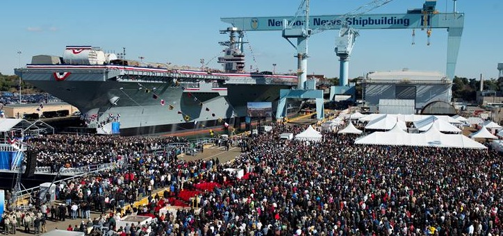 Photo by Huntington Ingalls Industries, Inc. Before a standing-room-only crowd of thousands, Susan Ford Bales, the ship’s sponsor and daughter of President Ford, smashed a bottle of American sparkling wine across the bow to christen the ship. During her remarks, she addressed the shipbuilders, reflecting on the relationships she has built with them during construction of her father’s namesake ship. “This shipyard’s motto, ‘Always Good Ships,’ is not just a phrase; it is a way of life here for over a century,” Bales said. “There is nothing—absolutely nothing—that can describe how proud I am to be your fellow shipbuilder. Your integrity and patriotic commitments to excellence are without equal. Shipbuilders of Newport News—you are a national treasure.” Since November 2006, more than 5,000 shipbuilders have helped to construct Ford, and suppliers from 46 states across the country have contributed specialized parts, skilled services and support to aircraft carrier production. In the weeks following the christening, the carrier will be launched into the James River and moved to a pier for outfitting and testing. The ship is scheduled for delivery to the U.S. Navy in 2016. “When USS Gerald R. Ford joins the Navy’s fleet in 2016, she will reign as America’s queen of the seas for 50 years,” said NNS President Matt Mulherin. “She will stand as a symbol of sovereign U.S. territory wherever she sails. She will represent her namesake—a man who embodied integrity, honor and courage. And she will forever carry with her the spirit of her sponsor, the strength of her crew and the heart of her shipbuilders.”