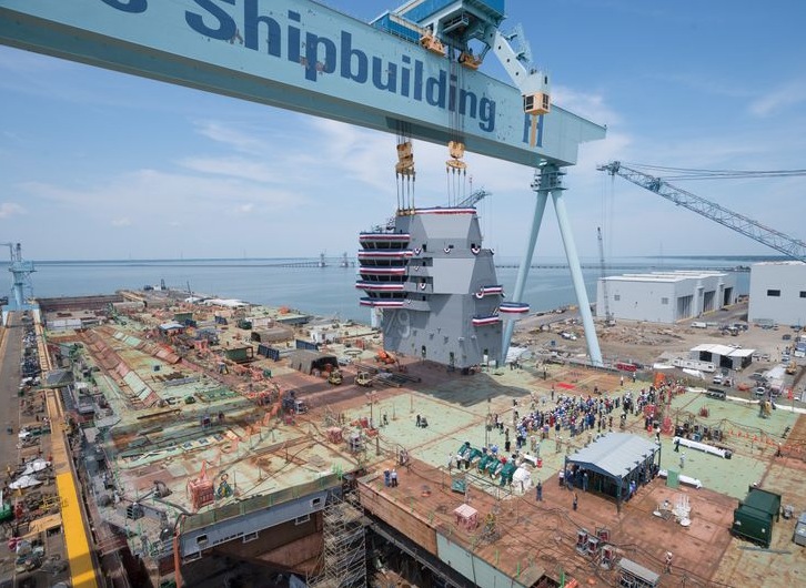The ship is being built in sections with more outfitted equipment—valves, pipe, electrical panels, mounting studs, lighting, ventilation and other components—than any other aircraft carrier built at Newport News. The use of new technologies, including digital work instructions that provide shipbuilders digital 3-D data versus traditional paper drawings, has increased efficiency and productivity. With the island, Kennedy is more than 90% structurally complete. The island stands 72 feet above the flight deck and is 56 feet long and 33 feet wide. In keeping with the Navy tradition, Capt. Todd Marzano, the ship's prospective commanding officer, placed his aviator wings underneath the island during the ceremony. This custom, known as mast-stepping, recognizes an ancient maritime custom of placing a coin at the base of a mast of a ship under construction to bring good fortune. “It’s an absolute honor and privilege to be selected as the first commanding officer of the new aircraft carrier John F. Kennedy, and I’m truly humbled to be joining such an impressive team of highly talented shipbuilders who have worked so hard to make this historic event possible,” Marzano said. “Landing the island on the flight deck is a significant construction milestone, bringing John F. Kennedy one very important step closer to being commissioned into the fleet, where its value to our nation cannot be overstated.” Caroline Kennedy, John F. Kennedy’s daughter, serves as the ship’s sponsor. She could not participate in today’s event but shared a 1964 silver Kennedy half dollar that Marzano placed under the island house. “The island landing is an important milestone in the life of this ship,” Kennedy wrote in a letter. “I know how proud my father would be of the ship that will bear his name and the patriotism and dedication of all who sail in her.” Boykin placed a Newport News Shipbuilding president’s coin, which was designed to recognize dedication, service and leadership—three qualities that the ship and its crew will demonstrate when they set sail in our nation’s defense, she explained. The other ceremony participants—James Geurts, assistant secretary of the Navy for research, development and acquisition; Rear Adm. Roy J. Kelley, commander, Naval Air Force Atlantic; and Rear Adm. Brian Antonio, program executive officer for aircraft carriers—also placed coins. A time capsule containing all of items placed under the island will be welded into the ship at a later time. Kennedy is scheduled to move from the dry dock to an outfitting berth in the fourth quarter of 2019, three months ahead of schedule. The ship’s christening is planned for later this year. More than 4,500 shipbuilders and 2,000 suppliers from across the country are supporting the construction of Kennedy. About Huntington Ingalls Industries Huntington Ingalls Industries is America’s largest military shipbuilding company and a provider of professional services to partners in government and industry. For more than a century, HII’s Newport News and Ingalls shipbuilding divisions in Virginia and Mississippi have built more ships in more ship classes than any other U.S. naval shipbuilder. HII’s Technical Solutions division provides a wide range of professional services through its Fleet Support, Mission Driven Innovative Solutions, Nuclear & Environmental, and Oil & Gas groups. Headquartered in Newport News, Virginia, HII employs more than 40,000 people operating both domestically and internationally. Huntington Ingalls Industries (HII) press release