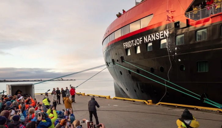 No Bubbles: Battery hybrid MS Fridtjof Nansen was named by crushing a chunk of ice in her hull. PHOTO: Kim Rormark/Hurtigruten Expeditions. Image by Hurtigruten Group. To honor the century-long Svalbard heritage, MS Fridtjof Nansen is also the first cruise ship ever to be registered in Longyearbyen. "By naming this unprecedented ship after Fridtjof Nansen, on Svalbard, we pay tribute to him as an explorer and a scientist and to the rich arctic legacy of Hurtigruten Expeditions. We also salute our long-lasting relationship with the Svalbard community. This small-sized, battery-hybrid powered expedition ship will explore all waters - and she will do so proudly calling Svalbard home," said Hurtigruten Expeditions CEO Asta Lassesen. At home - in Longyearbyen Hurtigruten Expeditions offers a wide range of all-year expedition cruises and on-land experiences to Svalbard - and expeditions to more than 30 countries and 250 destinations across the world. The company just added both the Galapagos Islands and pioneering expeditions to the unique West African archipelagos of the Bissagos Islands and Cape Verde to their range of offers. "Exploration is who we are. We will always explore. Today is a very special day for me and all my colleagues onboard this magnificent ship. We are thrilled to welcome guests onboard MS Fridtjof Nansen to co-explore the remote corners of the globe with us - and wholeheartedly committed to explore in the most sustainable and respectful manner," said MS Fridtjof Nansen Captain Bent Ivar Gangdal.