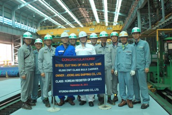 On September 30, 2013 at the Hull Processing Shop, Hyundai-Vinashin Shipyard (HVS) held Steel Cutting Ceremony for Hull No. S085, 63,000 DWT Bulk Carrier the first of series three (03) vessels built for Joong Ang Shipping Co., Ltd., Korea.