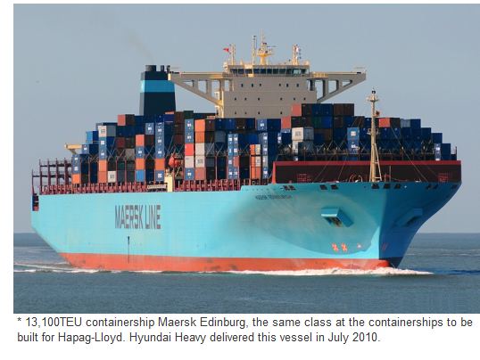 Hyundai Heavy, the world's largest shipbuilder, won a USD 1.45 billion deal to build ten 13,100 TEU containerships from Hapag-Lloyd, Germany's largest container shipping line.