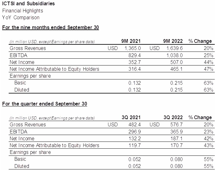 We remain mindful of the macro-economic environment and the potential impact this may have on our business but remain confident that we are well-positioned to navigate these headwinds through our agility, diversified portfolio and strong balance sheet. Our highly disciplined and talented team continues to work resolutely for the benefit of our stakeholders – all the time guided by our purpose, to make ports around the world a driver for positive and sustainable growth." International Container Terminal Services, Inc. (ICTSI) today reported unaudited consolidated financial results for the nine months of 2022 posting revenue from port operations of US$1.64 billion, an increase of 20 percent from the US$1.37 billion reported for the same period in 2021; Earnings Before Interest, Taxes, Depreciation and Amortization (EBITDA) of US$1.04 billion, 25 percent higher than the US$829.4 million generated the first three quarters last year; and net income attributable to equity holders of US$465.1 million, 47 percent more than the US$316.4 million earned in the first nine months of 2021 primarily due to higher operating income, net foreign exchange gain, equity share in net profit of joint ventures, and interest income; partially tapered by increase in interest on loans, lease liabilities and concession rights payable, and depreciation and amortization charges. Diluted earnings per share for the first nine months of 2022 was 63 percent higher at US$0.215 compared to US$0.132 in the same period in 2021. For the quarter ended September 30, 2022, revenue from port operations increased 20 percent from US$482.4 million to US$576.7 million; EBITDA was 23 percent higher at US$365.9 million from US$296.9 million; and net income attributable to equity holders was at US$170.7 million, 43 percent more than the US$119.7 million in the same period in 2021. Diluted earnings per share for the third quarter of 2022 was 55 percent higher at US$0.080 compared to US$0.052 the same period in 2021. ICTSI handled consolidated volume of 8,856,303 twenty-foot equivalent units (TEUs) in the first nine months of 2022, seven percent more than the 8,266,621 TEUs handled in the same period in 2021. The increase in volume was primarily due to volume growth and improvement in trade activities as economies continue to recover from the impact of the COVID-19 pandemic and lockdown restrictions; new shipping lines and services at certain terminals; the contribution of Manila North Harbour Port, Inc. (MNHPI) in Manila, Philippines and International Container Terminal Services Nigeria Ltd. (ICTSNL), the company’s new terminal in Port of Onne, Nigeria. Excluding the consolidation of MNHPI, ICTSNL, and Davao Integrated Port and Stevedoring Services Corporation (DIPSSCOR) in Davao, Philippines, which was terminated last June 30, 2022, consolidated volume would have increased by six percent. For the quarter ended September 30, 2022, total consolidated throughput was 11 percent higher at 3,103,721 TEUs compared to 2,807,098 TEUs in 2021. Gross revenues from port operations for the first nine months of 2022 was 20 percent higher at US$1.64 billion compared to the US$1.37 billion reported in the same period in 2021 mainly due to volume growth and market recovery from the impact of the pandemic; favorable container mix; tariff adjustments at certain terminals; new contracts with shipping lines and services; higher revenues from ancillary services; contribution of MNHPI and the new terminals Manila Harbor Center Port Services, Inc. (MHCPSI) in the Philippines, ICTSNL in Nigeria and IRB Logistica in Brazil; partially tapered by decline in trade activities at certain terminals; and unfavorable translation impact mainly due to the depreciation of Philippine Peso (PHP)- and Australian Dollars (AUD)- based revenues at Philippine terminals and Victoria International Container Terminal (VICT) in Melbourne, Australia, respectively; and Euro (EUR)-based revenues at Madagascar International Container Terminal Services Ltd. (MICTSL) and Adriatic Gate Container Terminal (AGCT), in Madagascar and Croatia respectively. For the third quarter of 2022, gross revenues increased 20 percent from US$482.4 million to US$576.7 million. Consolidated cash operating expenses in the first nine months of 2022 was 14 percent higher at US$438.1 million compared to US$383.2 million in the same period in 2021. The increase in cash operating expenses was mainly due to the cost contribution of MNHPI, the new businesses, mainly MHCPSI, ICTSNL and IRB Logistica; the increase in equipment and facilities-related expenses, mainly fuel; government-mandated and contracted salary rate adjustments, including benefits; contracted services in relation to volume; and the unfavorable foreign exchange impact of the Brazilian Reais (BRL)-based expenses at ICTSI Rio and Tecon Suape S.A. (TSSA) in Brazil; partially tapered by continuous cost optimization measures implemented; and the favorable foreign exchange effect mainly of Philippine Peso (PHP)-, Pakistani Rupee (PKR)-, Australian Dollar (AUD)-, Polish Zloty (PLN)- and Argentine Peso (ARS)-based expenses at Philippine, Pakistan, Australia, Poland and Argentina terminals, respectively. Consolidated EBITDA increased 25 percent to US$1,038.0 million for the first nine months of 2022 from US$829.4 million in the same period in 2021 mainly due to higher revenues, partially tapered by the increase in cash operating expenses. Consequently, EBITDA margin increased to 63 percent in the first nine months of 2022 from 61 percent the previous year. Consolidated financing charges and other expenses for the first nine months of 2022 increased by 24% to US$130.8 million from US$105.5 million in 2021 mainly due to higher interest and financing charges on borrowings primarily due to the issuance of US$300 million senior notes in November 2021 which funded the redemption of US$183.8 million worth of 5.875 percent and US$85.2 million of 4.875 percent seni