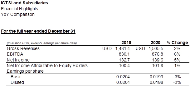 "We were swift to take action at the start of the pandemic to initiate cost reduction, reduce capital expenditures, and later seized opportunities to lengthen our debt maturities at lower rates. At the same time, we stepped up our social community support and increased health and safety measures at all our ports to ensure that we all remain resilient in these extraordinary times. These actions have helped us to navigate a severe weakening of demand at some of our key terminals around the world. And as our volumes rebounded from their lows when lockdown restrictions began to lift in the second half, so did our margins reflect the benefits of these actions. Those gains have continued into the new financial year as ICTSI emerges from these trying times leaner, stronger and optimistic of the future as governments around the world begin the herculean task of global mass vaccination." International Container Terminal Services, Inc. (ICTSI) today reported audited consolidated financial results for 2020 posting revenue from port operations of US$1.505 billion, two percent higher compared to the US$1.481 billion reported last year; Earnings Before Interest, Taxes, Depreciation and Amortization (EBITDA) of US$876.8 million, six percent more than the US$830.1 million generated in 2019; and net income attributable to equity holders of US$101.8 million, one percent higher than the US$100.4 million earned in 2019 mainly due to higher revenues, lower cash operating expenses resulting from continuous group-wide cost reduction and optimization measures, positive contribution of a new terminal in Rio de Janeiro, Brazil, and lower equity in net loss of joint ventures; tapered by an increase in interest on concession rights payable recognized at the new terminal in Cameroon and the full year impact of the new terminal in Brazil; additional impairment charges; and COVID-19 related expenses. Equity in net loss of joint ventures was lower by 38 percent at US$12.3 million in 2020 from US$19.7 million in 2019 mainly due to the decrease in the Company’s share in net loss at Sociedad Puerto Industrial Aguadulce S.A. (SPIA), its joint venture container terminal project with PSA International Pte Ltd. (PSA) in Buenaventura, Colombia and an increase in the Company’s share in net income in Manila North Harbor Port, Inc. (MNHPI). Diluted earnings per share declined three percent to US$0.0198 from US$0.0204 in 2019. Excluding non-recurring charges, recurring net income in 2020 was nine percent higher at US$282.1 million compared to the US$259.1 million earned the previous year.