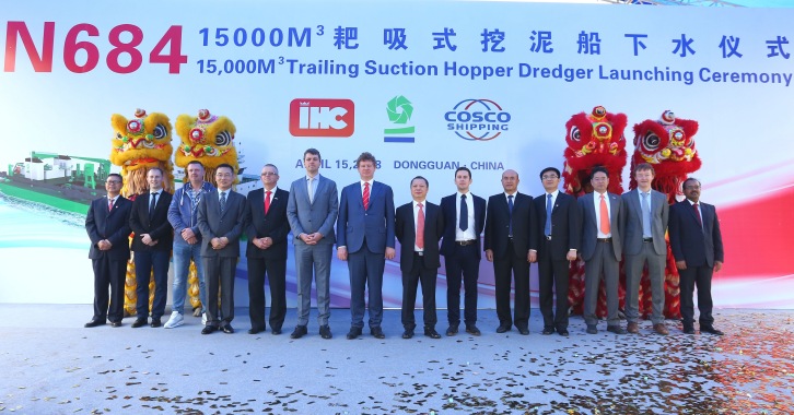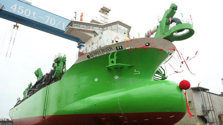 18 April 2018 Last Sunday, April 15 2018, DEME's latest trailing suction hopper dredger (TSHD) BONNY RIVER was successfully launched at Royal IHC's partner yard COSCO Guangdong Shipyard in China. The trailing suction hopper dredger has a capacity of 15,000 m3 and a maximum dredging depth of 102 meters. The BONNY RIVER is a technically smart designed hopper dredger. The vessel combines various functions, such as the ability to dredge hard soil with its Heavy Duty suction tube combined with the ability to reach great depths with its XXL tube. Environmentally friendly aspects such as minimizing turbulence with its closed process water circuit, installation of dual-fuel engines and CLEANSHIP & Green Passport notation make BONNY RIVER a versatile TSHD. This green flagship for DEME is ready to carry out the most demanding projects with minimal impact on the environment. This successful launching is an important milestone in the construction process of the BONNY RIVER. In the coming weeks, the ship will be commissioned and put into operation.