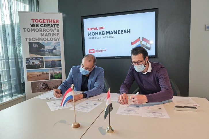 19 March 2021 Royal IHC officially handed over the cutter suction dredger (CSD) MOHAB MAMEESH to the Suez Canal Authority (SCA) on Thursday 18 March. The vessel is now ready for its official duties after successfully completing commissioning tests on the Dutch coastline and Haringvliet. With the delivery of the 29,190kW heavy-duty rock CSD, SCA now owns one of the most powerful dredgers in the world. With an overall length of 147.4 metres and a total installed cutter power of 4,800kW, the MOHAB MAMEESH can dredge to a depth of 35 metres. There are also accommodation facilities on board that can house over 70 people. The MOHAB MAMEESH will primarily be deployed to maintain and improve the artificial sea-level area that connects the Mediterranean and Red seas. As the vessel was designed in close cooperation with SCA, it has the capacity to work effectively in the harsh conditions of the region. The new CSD will now be transported to Egypt. It will be first loaded on to a semi-submersible cargo vessel next week, after which it will depart from Rotterdam to the Suez Canal. Its sister vessel – HUSSEIN TANTAWY – is expected to depart for sea trials in the next couple of months. "We were confident from the start of the project that Royal IHC was the right partner for this important assignment," says SCA's Chairman and Managing Director, Admiral Osama Rabie. "The MOHAB MAMEESH is a truly impressive vessel and many people are enthusiastic to see it performing live operations as soon as possible. We expect to achieve incredible results with this state-of-the-art CSD for many years to come." Royal IHC’s CEO, Gerben Eggink, adds: "I'd like to reconfirm the sentiments we held at the start of this journey, that we were – and remain – truly honoured that SCA placed its trust in Royal IHC for such an innovative vessel. A great deal of hard work and dedication has led to this moment, and many people will feel deep satisfaction at seeing the final result. We would like to wish the owners and crew of the MOHAB MAMEESH good fortune and smooth sailing."