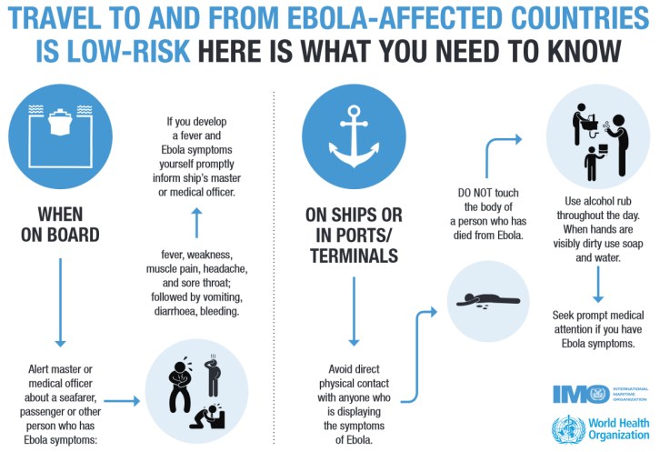 The Statement on the 3rd meeting of the IHR Emergency Committee regarding the 2014 Ebola outbreak in West Africa notes that previous recommendations regarding the travel of Ebola virus disease cases and contacts should continue to be implemented. IMO has issued an infographic “What you need to know” which can be downloaded and used on board ships and in ports and terminals. The infographic will shortly be available in all six official languages of the Organization. The WHO notes that while a number of States have recently introduced entry screening measures, WHO encourages countries implementing such measures to share their experiences and lessons learned. Entry screening may have a limited effect in reducing international spread when added to exit screening, and its advantages and disadvantages should be carefully considered. If entry screening is implemented, States should take into account the following considerations: it offers an opportunity for individual sensitization, but the resource demands may be significant, even if screening is targeted; and management systems must be in place to care for travellers and suspected cases in compliance with International Health Regulations (IHR) requirement. IMO – the International Maritime Organization – is the United Nations specialized agency with responsibility for the safety and security of shipping and the prevention of marine pollution by ships. Source: IMO