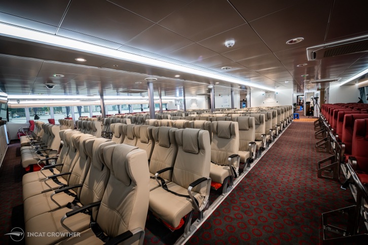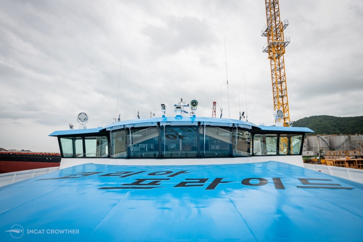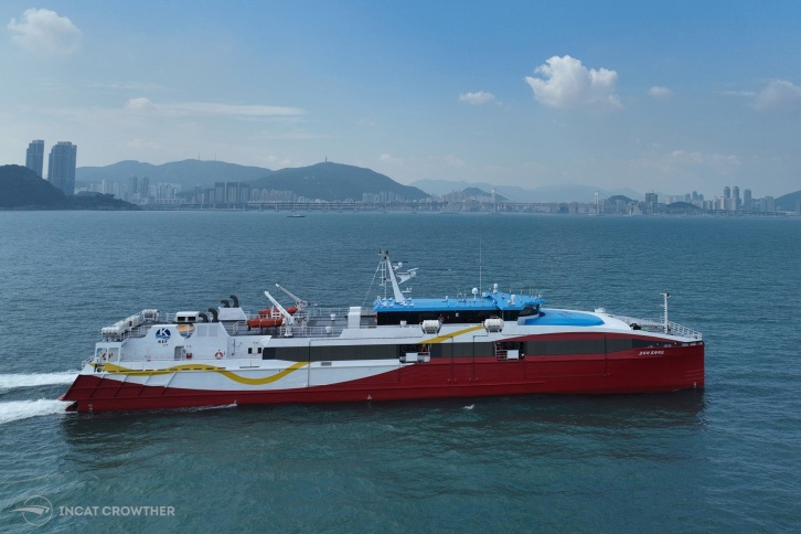 15 Sep 2022 Incat Crowther is pleased to announce the launch of the 72m passenger ferry Korea Pride. Incat Crowther supported Korea Express Ferry in the building of the ship that will operate from Incheon on the west coast of South Korea. In procuring such a ferry, Korea Express Ferry set very high safety, comfort and performance standards. The operator also specified that the ship be built locally, becoming the first ship of this type constructed in South Korea. Incat Crowther was selected to design the ship and supervise its construction at Kangnam Corporation in Busan. This choice was based on Incat Crowther’s digital shipbuilding credentials and operator-focused design. “It’s a great example of our approach to using global experience to support local building”. said Dan Mace, Technical Manager. The finished product highlights the developed capability to build this class of ship locally in South Korea. Korea Pride features a sleek, single-deck configuration, which Mace explains was selected to handle the specific conditions which include large swell and wind chop. “Safety and open sea capability drove our design and build. The 72m platform is longer than usual for a single-deck ship. This delivers greater speed without sacrificing fuel efficiency.” Sung Man Hwang, C.E.O. of Korea Express Ferry, is full of praise for the new ship. “We are very pleased with the outcome.” He said. “Incat Crowther’s contribution to the project cannot be understated. We received a high-quality ship that reached an impressive 41 knots on sea trials. It is a very happy day for us to take delivery of such an extraordinary ship. It will serve our passengers very well”. A full complement of 556 passengers will be accommodated across a single deck. To maximise safety and efficiency, passengers board and disembark via six boarding gates/doors, located to integrate with shoreside infrastructure. On board, passengers are served by economy, business and first-class cabins. A central amenities block features a large, well-equipped kiosk in addition to bathrooms and a mothers’ room. Luggage racks are plentiful in all cabins. At the aft end of the main deck is a crew area with mess room, office and bathroom. The ship also has a medical room. Korea Pride is powered by quad MTU 16V4000 main engines, with neat and tidy engine room layout and exposed engine hatches aiding maintenance and removal. The ship has an operating speed of 36.5 knots. The ship will be a lifeline for many who live on and trade and travel between these Korean islands and the mainland. Video by Incat Crowther