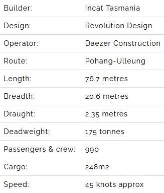 Incat Tasmania awarded a contract to build a 76 metre high speed catamaran for South Korea January 17, 2022 Australian high speed craft specialist Incat Tasmania is pleased to announce a contract to build a new fast ferry for Daezer Construction of South Korea. Work on the new 76 metre craft has already commenced with delivery scheduled for the first quarter of 2023. The high speed ferry will operate for Daezer on the line between Pohang and Ulleung, an island 117 nautical miles off the eastern coast of South Korea where the main economic activity is tourism. Incat Tasmania Chairman Robert Clifford says Incat is no stranger to South Korean waters having delivered its first vessel to the region in 1995, the still highly regarded, Incat hull 037, Sunflower. “Sunflower served Ulleung island for 25 years and was only recently retired by Daezer in compliance with South Korean ship age limits. “This new craft will benefit from Incat’s evolved tried and proven hullform, with its new bow arrangement and will lead the local market in terms of seakeeping for vessels of its size. The 76 metre is expected to be a successful model for the future with the first of this type due for delivery to another South Korean operator, SeaWorld Express Ferries, at the end of March this year” he says. Incat Tasmania CEO Tim Burnell says that in these continuing days of Covid-19, this new order is exceptionally good news for the yard. “At Incat we are fortunate to have the best quality, most highly experienced workforce in the global fast ferry industry and we are pleased to add this new vessel to those recently delivered to our customers around the world.”