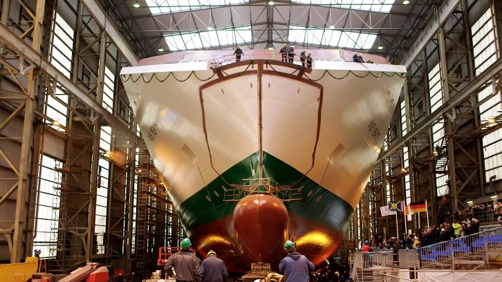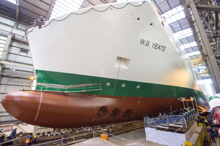 19 Jan 2018 The completed hull of the new Irish Ferries cruise ferry W. B. Yeats – ceremonially named by Ms. Rikki Rothwell – was launched into the water earlier today (12.00hrs, Friday, 19th January, 2018) at the shipyard of Flensburger Schiffbau–Gesellschaft in Flensburg, Germany where the vessel is being built. Fully painted in familiar Irish Ferries lettering and colours, and bearing the name W. B. Yeats along its bow and stern sections – the name having been chosen after drawing strong support from the public in an online competition that attracted nearly 100,000 entries – the vessel entered the water stern first. There to attend the event, alongside shipyard workers and officials, were representatives of the company led by Irish Continental Group Plc chairman John McGuckian, chief executive, Eamonn Rothwell, CFO, David Ledwidge, and Irish Ferries managing director, Andrew Sheen. The €150 million, 54,985 gross tonnes cruise ferry will arrive into Dublin next July when it will enter year-round service on Ireland – France and Dublin – Holyhead routes. In the intervening months, remaining construction work on the hull will be completed and the vessel fitted out with all of the technical, operational, décor, furnishings and passenger amenities required onboard. Later, before scheduled services can commence, it will undergo sea trials, crew training and docking procedures at the Irish, UK and French ports into which it will operate. Set to be the largest and most luxurious ferry ever to sail on the Irish Sea, the W. B. Yeats will have space for 1,885 passengers and crew, 435 cabins including luxury suites with their own private balconies, and almost 3km of car deck space. In a comment, Mr. Sheen said: “the launch of our new cruise ferry W. B. Yeats – and the expectation of our second new cruise ferry yet to come – herald in a new era in ferry travel between Ireland, UK and Continental Europe bringing with it new standards in terms of passenger and freight capacity, comfort and reliability beyond anything previously envisaged”. Second Vessel In addition, the Flensburg shipyard in which the vessel is being built will shortly commence building a second, even larger cruise ferry for delivery in 2020 which was commissioned only weeks ago by Irish Ferries parent, Irish Continental Group plc at a contract price of €165.2 million. Intended for service on the Dublin – Holyhead route, this second new vessel will be the largest cruise ferry in the world in terms of vehicle capacity with accommodation for 1,800 passengers and crew. Its vehicle decks will have 5,610 freight lane metres, providing the capability to carry 330 freight units per sailing – a 50% increase in peak freight capacity compared to the current vessel Ulysses. Video by Irish Ferries Ltd.